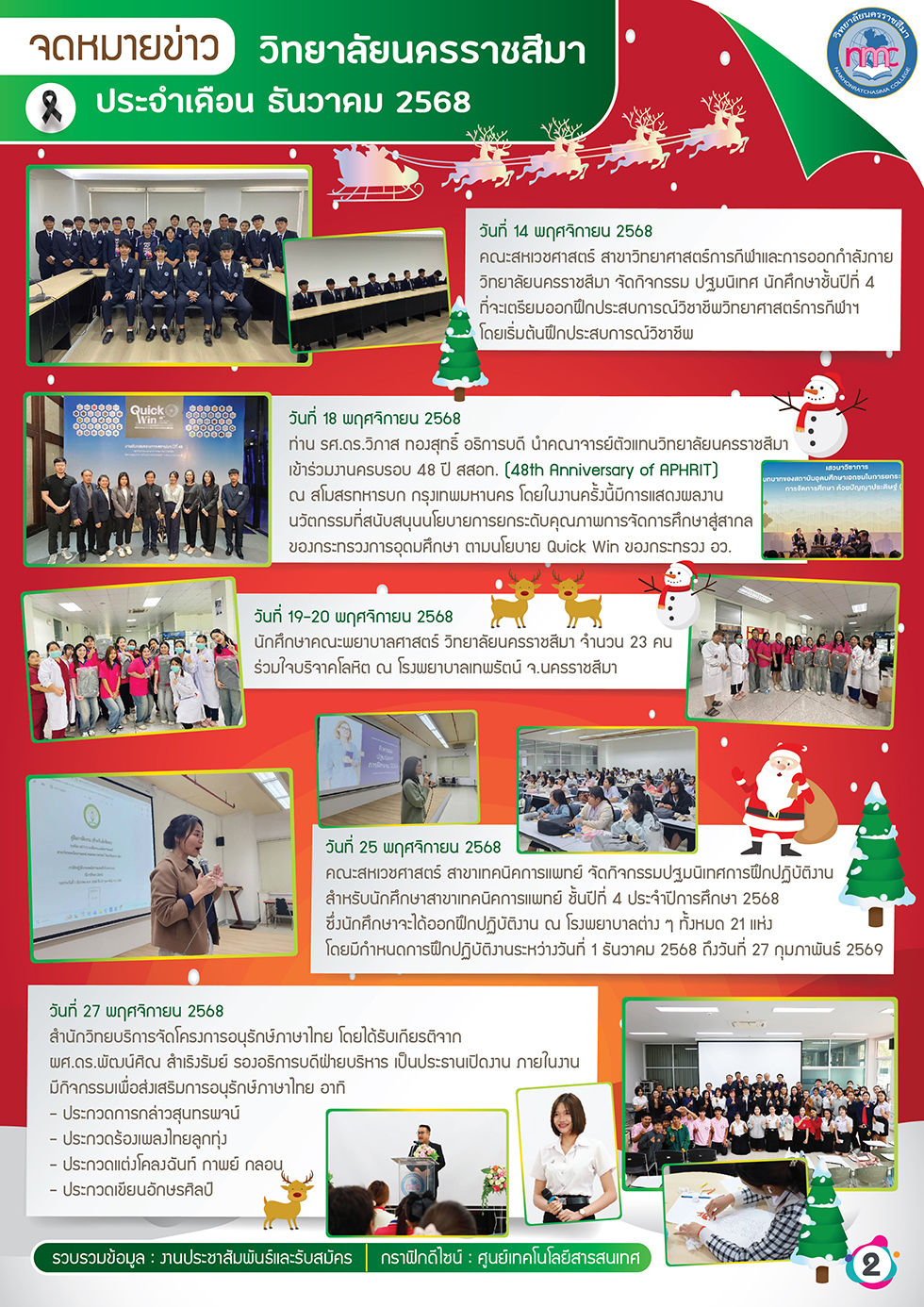๕ ธันวาคม วันชาติและวันพ่อแห่งชาติ ประจำปีการศึกษา ๒๕๖๘ วันพฤหัสบดีที่ ๔ ธันวาคม พ.ศ. ๒๕๖๘ สำนักพัฒนานักศึกษาและศิลปวัฒนธรรม จัดโครงการ ๕ ธันวาคม วันชาติและวันพ่อแห่งชาติ โดยมีท่าน รองศาสตราจารย์ ดร.วิภาส ทองสุทธิ์ อธิการบดีวิทยาลัยนครราชสีมา เป็นประธานในพิธี โดยภายในงานเริ่มด้วยพิธีกล่าวน้อมรำลึกในพร |