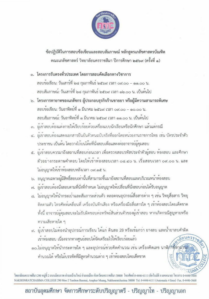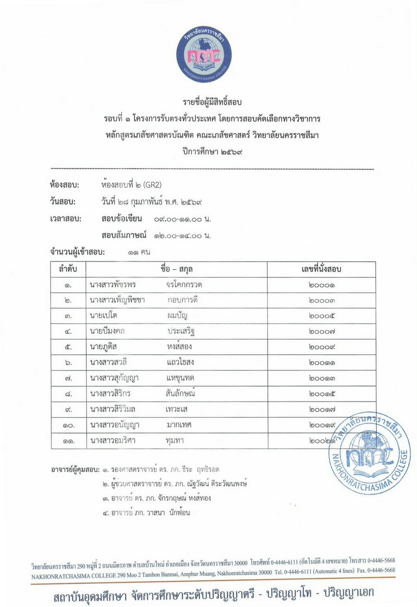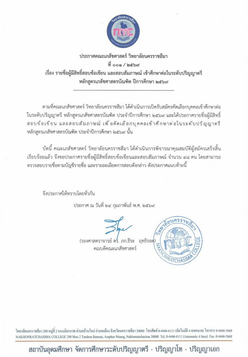 : ประกาศรายชื่อผู้มีสิทธิ์เข้าสอบข้อเขียนและสัมภาษณ์ หลักสูตรเภสัชศาสตรบัณฑิต ปีการศึกษา 2569