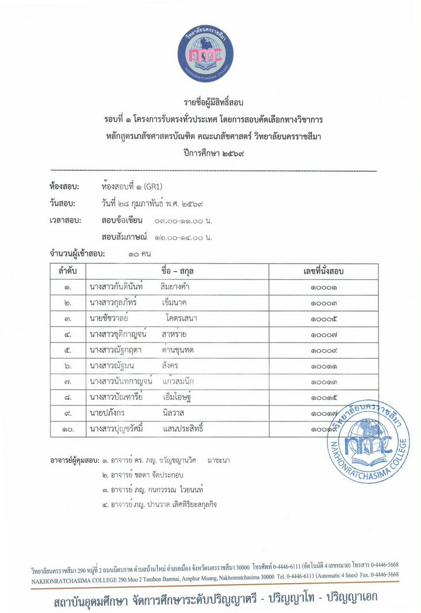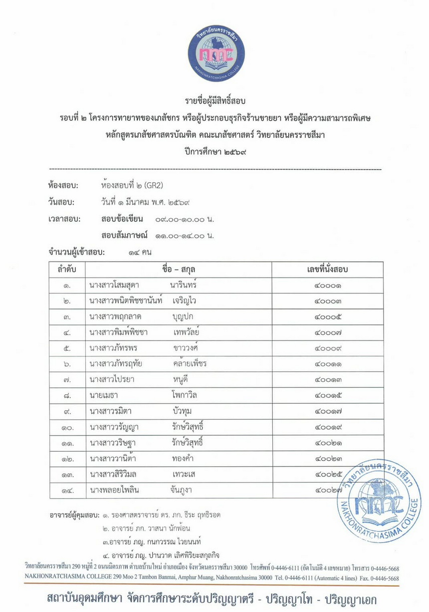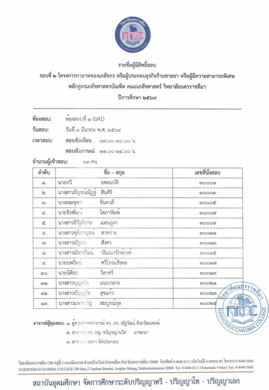 : ประกาศรายชื่อผู้มีสิทธิ์เข้าสอบข้อเขียนและสัมภาษณ์ หลักสูตรเภสัชศาสตรบัณฑิต ปีการศึกษา 2569