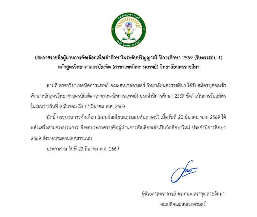 หัวข้อ : ประกาศรายชื่อผู้ผ่านการคัดเลือกเพื่อเข้าศึกษาในระดับปริญญาตรี ปีการศึกษา 2569 (รับตรงรอบ 1) หลักสูตรวิทยาศาสตรบัณฑิต (สาขาเทคนิคการแพทย์) วิทยาลัยนครราชสีมา