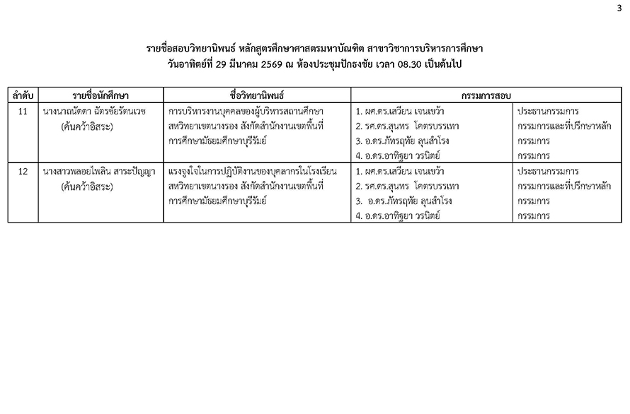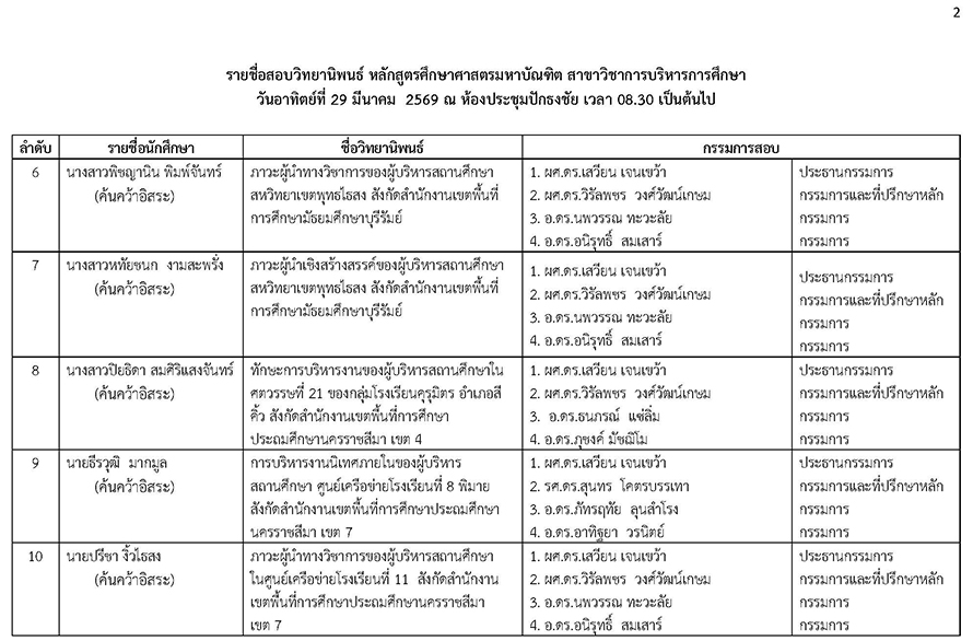 หัวข้อ : ประกาศรายชื่อสอบวิทยานิพนธ์ หลักสูตรศึกษาศาสตรมหาบัณฑิต สาชาวิชาการบริหารการศึกษา วันอาทิตย์ที่ 29 มีนาคม 2569 ณ ห้องประชุมปักธงชัย