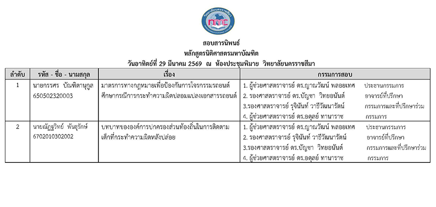 : ประกาศรายชื่อสอบสารนิพนธ์ หลักสูตรนิติศาสตรมหาบัณฑิต วันอาทิตย์ที่ 29 มีนาคม 2569 ณ ห้องประชุมพิมาย