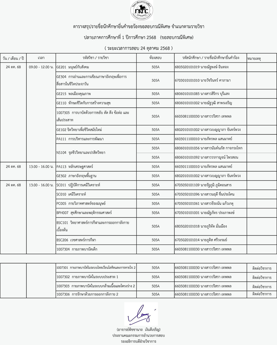 : ตารางสรุปรายชื่อนักศึกษายื่นคำร้องขอสอบกรณีพิเศษปลายภาค ภาคการศึกษาที่ 1 ปีการศึกษา 2568